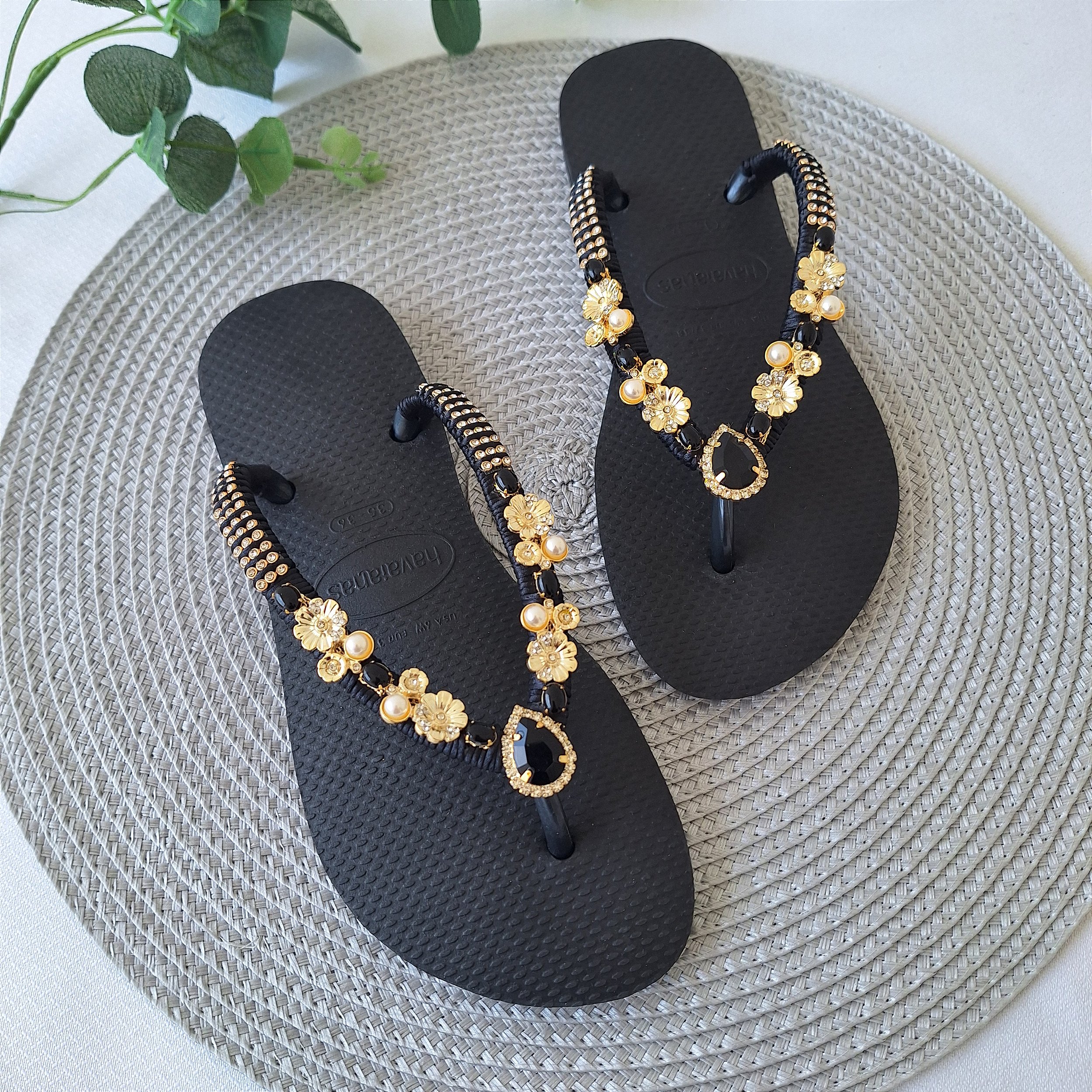 Havaianas modelo slim, preta decorada com pedrarias de luxo.
